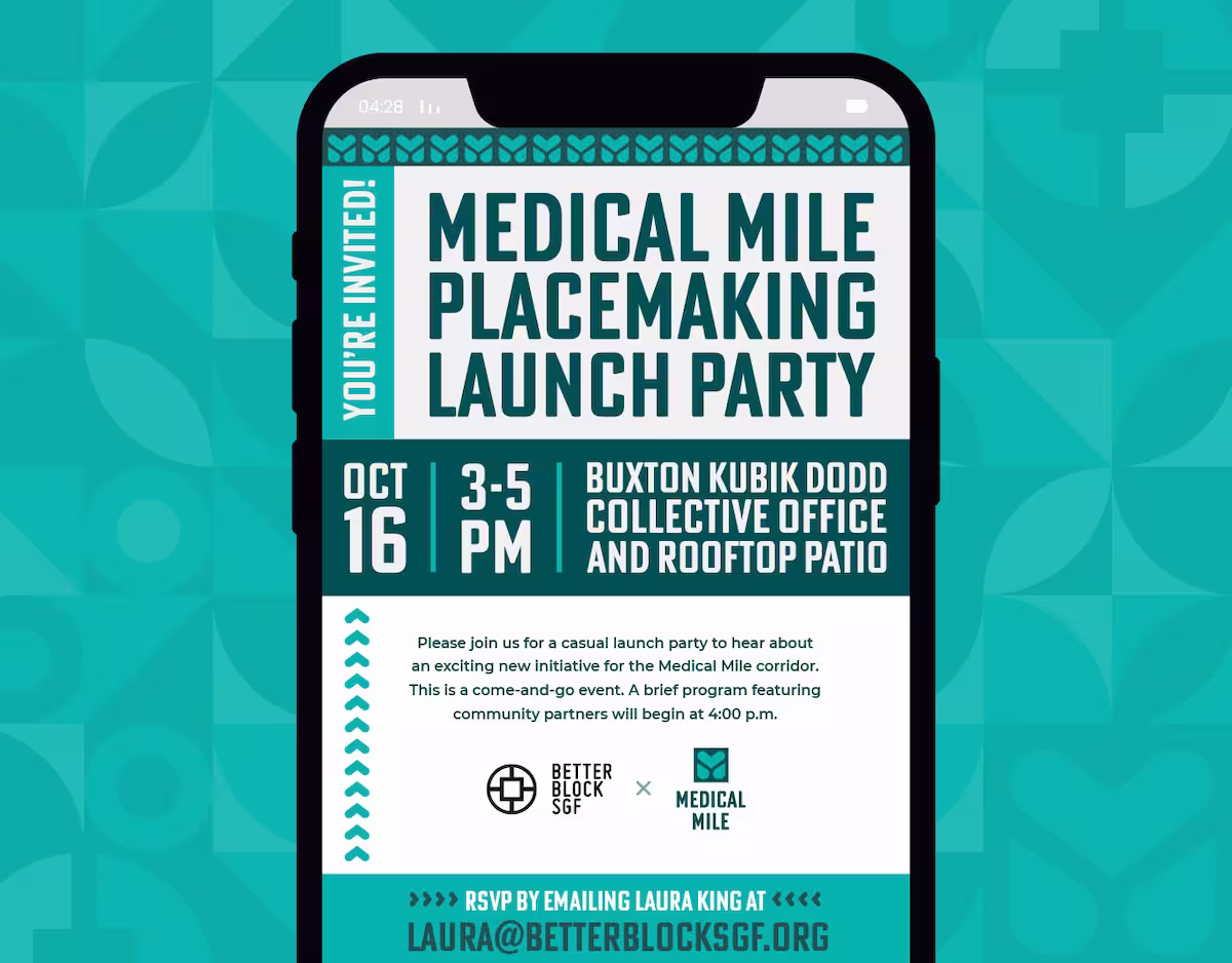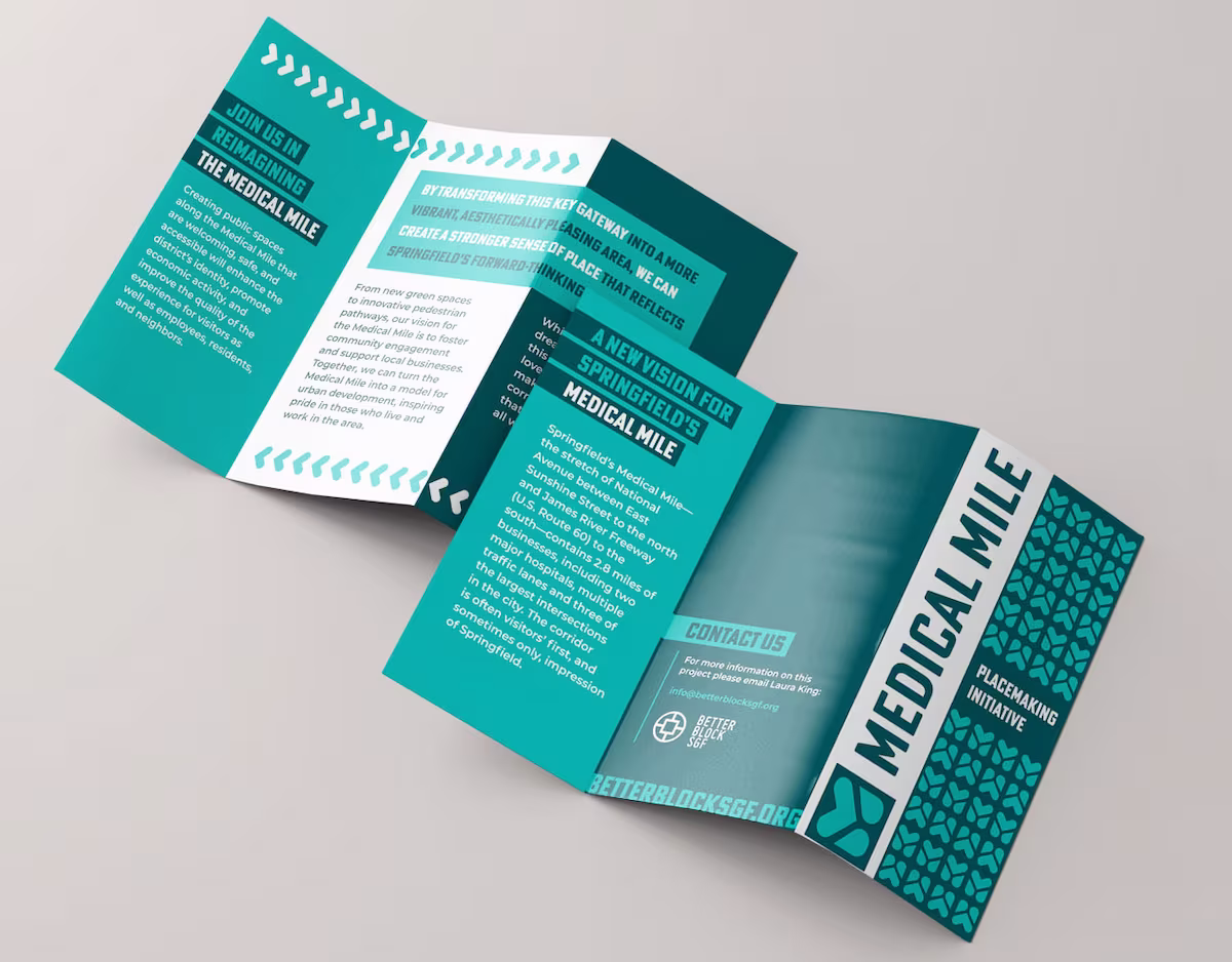 Better Block SGF partnered on a placemaking initiative to reimagine the Medical Mile, a 2.8-mile gateway corridor along National Avenue in Springfield anchored by hospitals, businesses, and major intersections. I designed a custom logo with a hidden heart and location markers in the “M” to reference the area’s healthcare presence and support future wayfinding. Approachable typography and a bright, calming color palette were designed to scale across print and digital touchpoints, including a launch invitation, project brochure, fundraising materials, and presentation boards—helping communicate a vision for a more walkable, welcoming, and community-focused corridor.