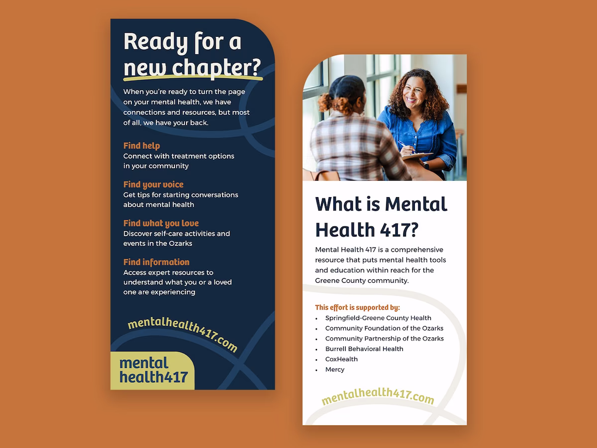 The Springfield-Greene County Health Department’s Mental Health 417 initiative serves as a central hub for information, resources, and community connection. The initiative needed its own brand identity, aiming to increase presence and awareness within the community while creating a foundation for ongoing mental health outreach across the county.